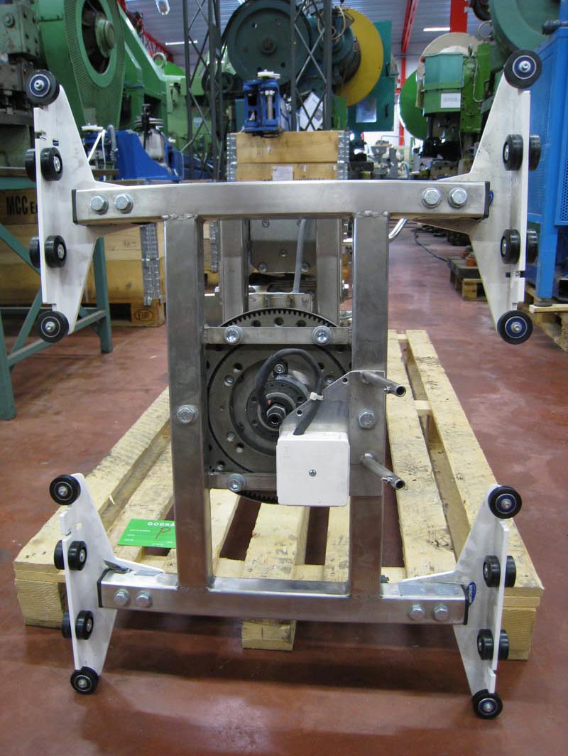 Vacuum gripper including hand controls to control the vertical movement. The gripper has 8 pcs suction cups and a two-hand control for activation/deactivation of suction cups.